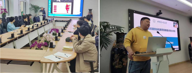 会议邀请了保卫处防火办公室工程师王继刚和实验室与设备管理处高级工程师宋彬,分别对《公共消防安全培训》和《高等学校实验室安全检查项目表》中的重点内容进行讲解,并就消防和高校实验室安全等内容进行培训交流。