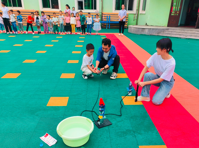 在水火箭实验中,志愿者们向小朋友们展示了如何利用水和气压的原理,制作并发射水火箭。小朋友们兴致勃勃地观察着火箭升空的壮观景象,不仅学到了科学知识,还体验到了实践的乐趣。