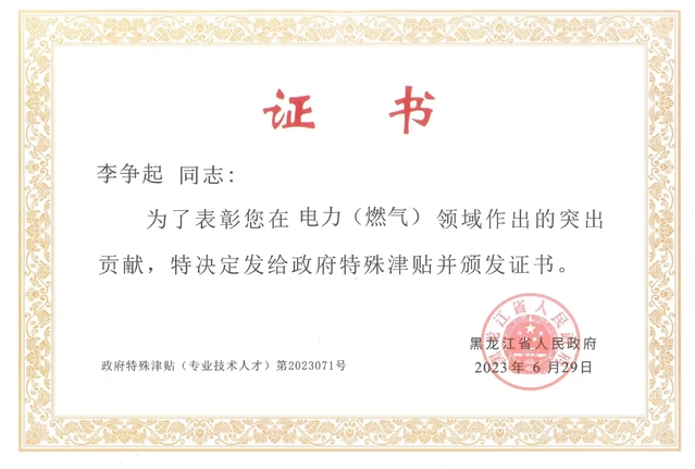 近日,为表彰6776永利集团李争起教授在电力(燃气)领域作出的突出贡献,黑龙江省人民政府决定给予李争起教授2023年度政府特殊津贴并颁发证书。
